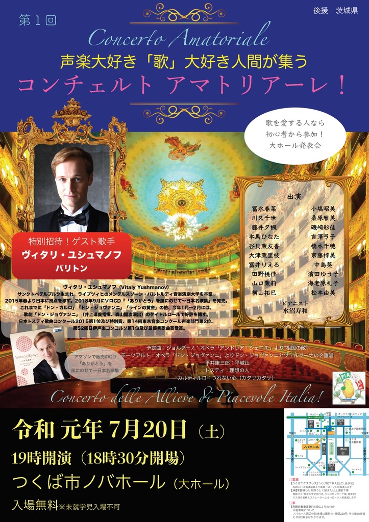 2019-07-16 第1回コンチェルト アマトリアーレ 7月20日19時 ノバホール ノバホールの今月のイベント案内リストで見つけました。 画像がうまく出ないので、ロードしなおします。 土浦のオペラ声楽教室の発表会ですが、第1回ということで、ポスターの特別ゲストを招待して、なかなか張り切っておられます。
